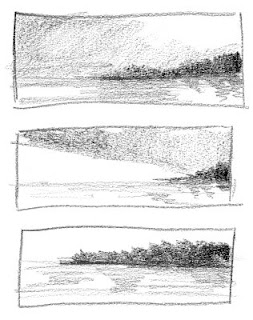 Die drei Kurzskizzen zeigen, wie unterschiedlich eine dunkle Landmasse wirken kann, je nachdem, wieviel Gewicht ihr in dem Bild geben wird.