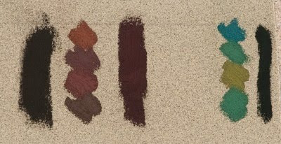 An dieser Stelle zeigt es sich, wie wichtig es ist, sich die Sortimente anderer Hersteller anzuschauen. Im unteren Foto sind in der Mitte die jeweils dunkelsten Farbtöne von Rot- bzw. Grüntönen der Firma Rembrand abgebildet. Daneben habe ich die jeweils dunkelsten Töne von Sennelier gesetzt.